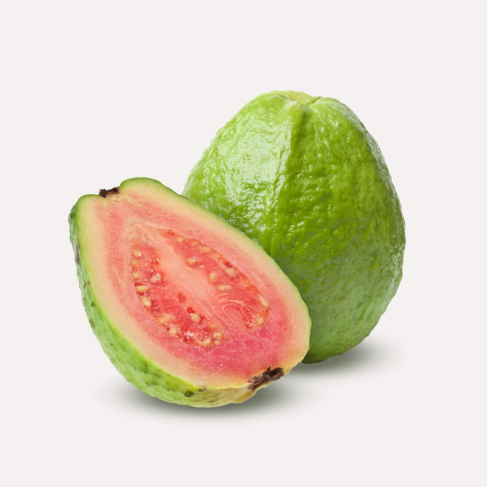 Guava is a tropical fruit with a sweet and tangy taste, usually round or oval in shape. Its skin can be green or yellow, and the inside pulp may be white, pink, or red, filled with tiny edible seeds. It is rich in Vitamin C, dietary fiber, and antioxidants, making it excellent for boosting immunity and digestion.